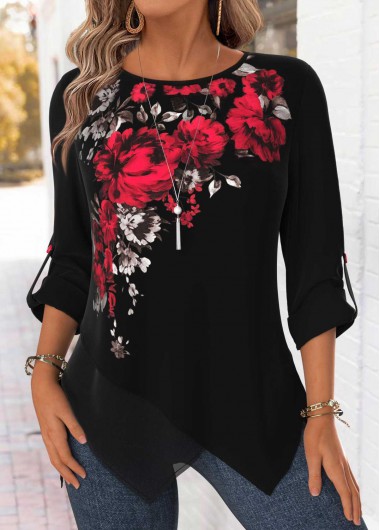 Black Tummy Coverage Floral Print Long Sleeve Blouse