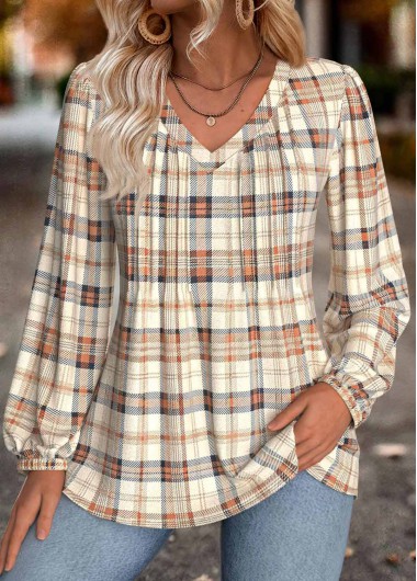 Light Coffee Tummy Coverage Plaid Long Sleeve Blouse