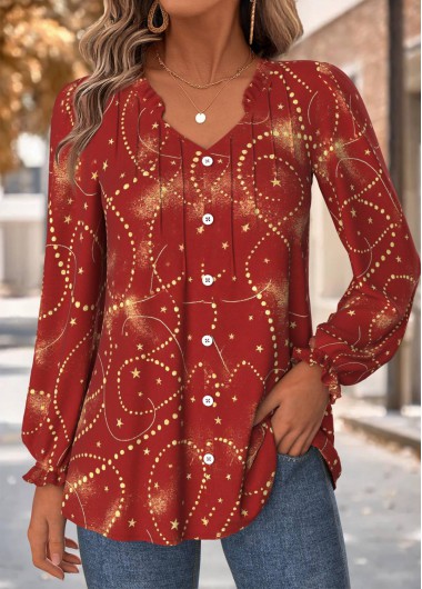 Wine Red Tummy Coverage Geometric Print Long Sleeve Blouse