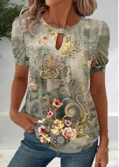 Sage Green Tuck Stitch Random Floral Print T Shirt