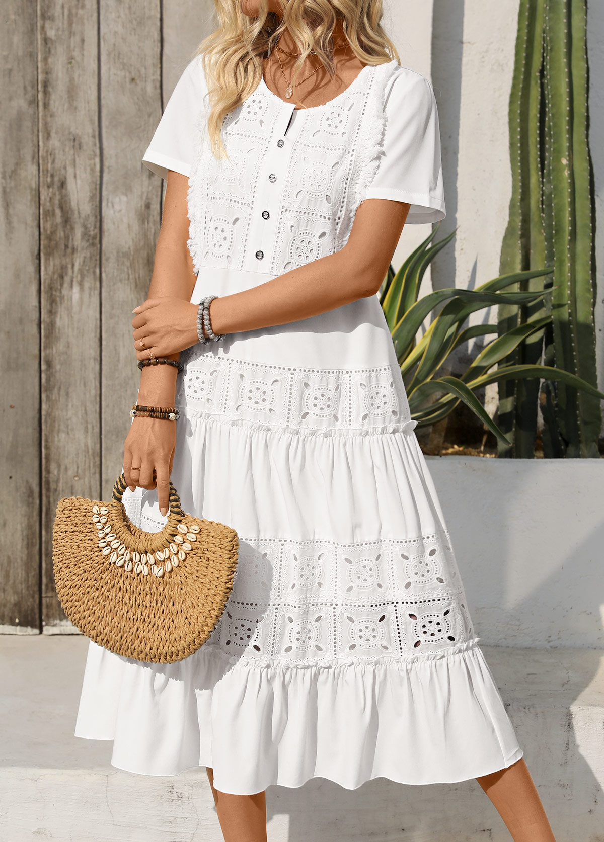 White Leaf Print Smocked Short Sleeve Split Neck Dress