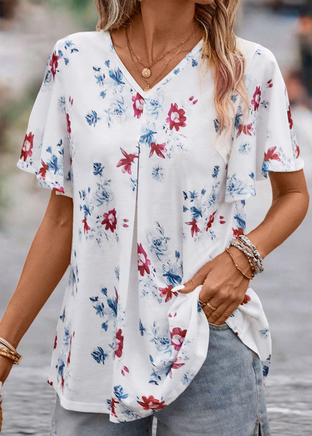 women's clothes / Tops / Shirts  /  White Floral Print Short Sleeve V Neck Blouse