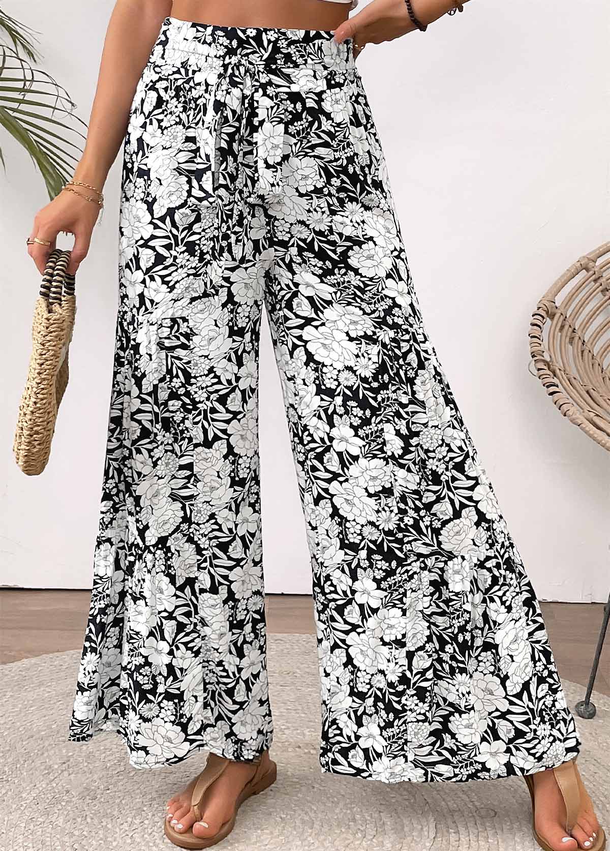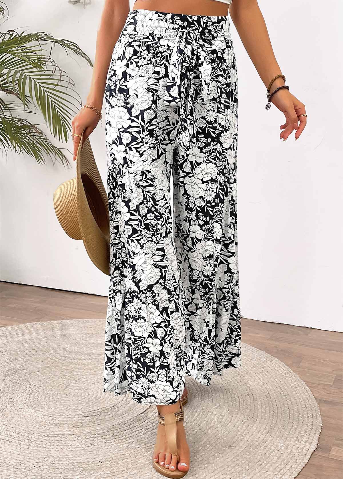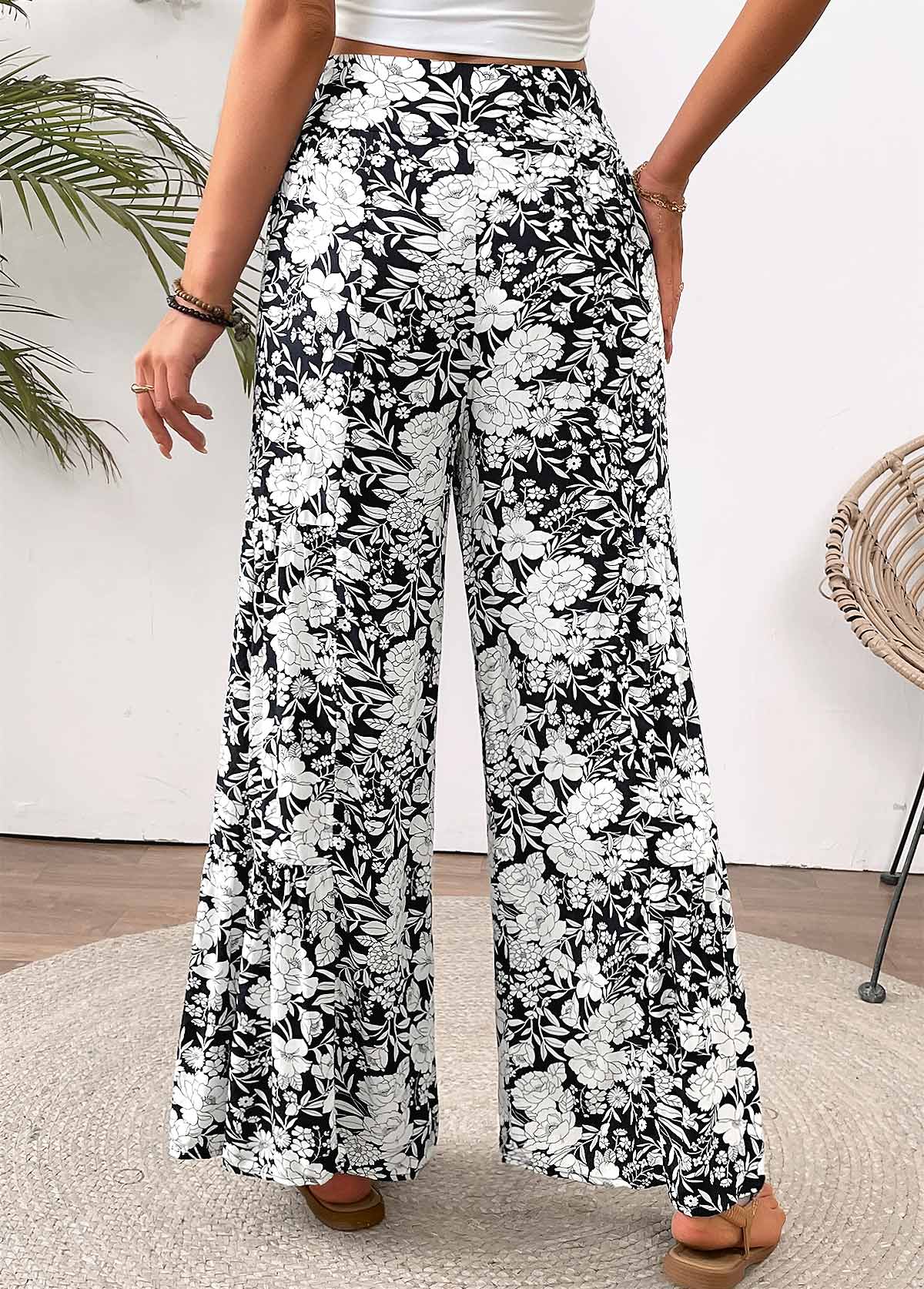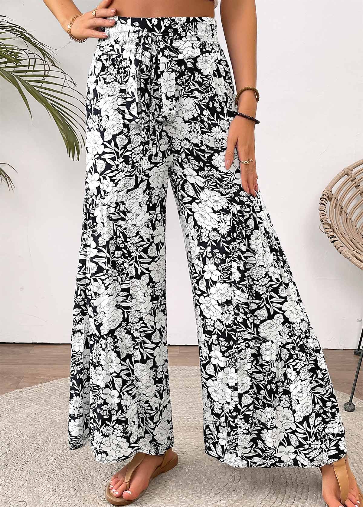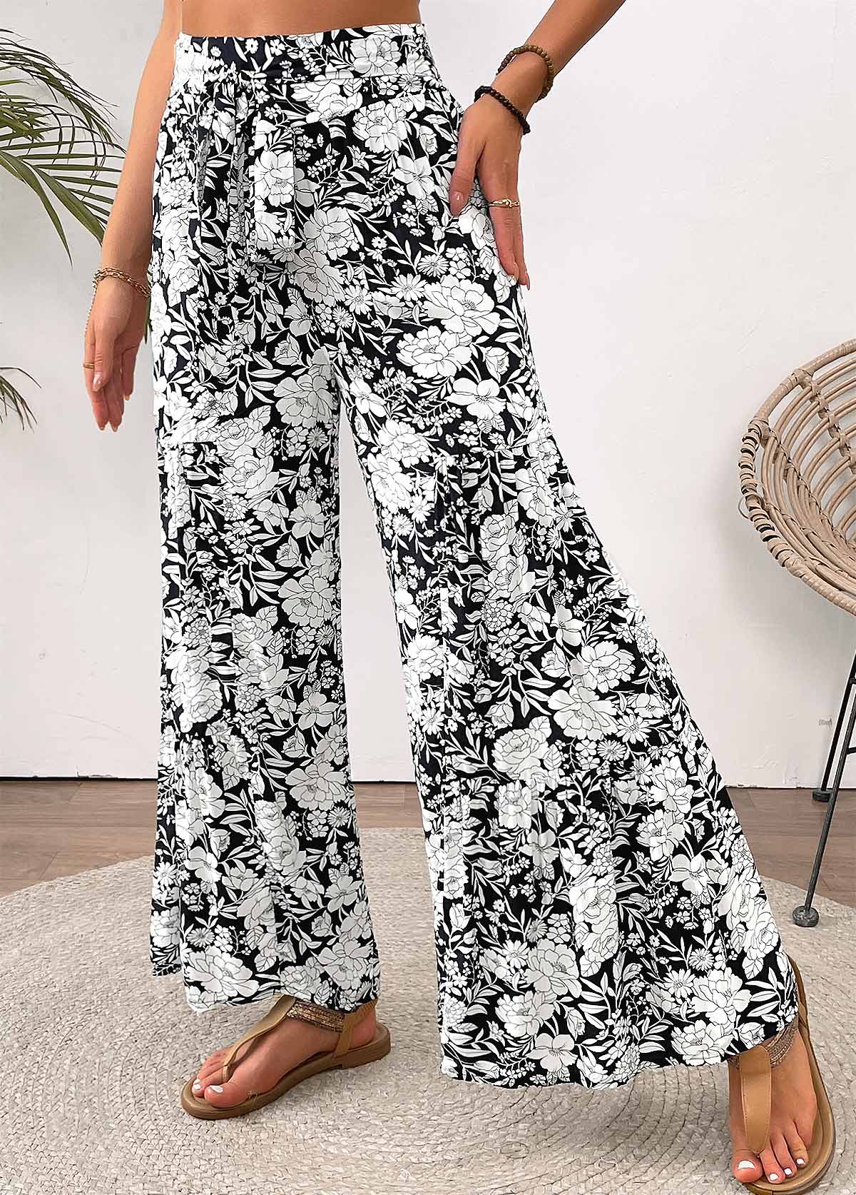 women's clothes / Bottoms / Pants  /  White Floral Print Wide Leg Elastic Waist Pants
