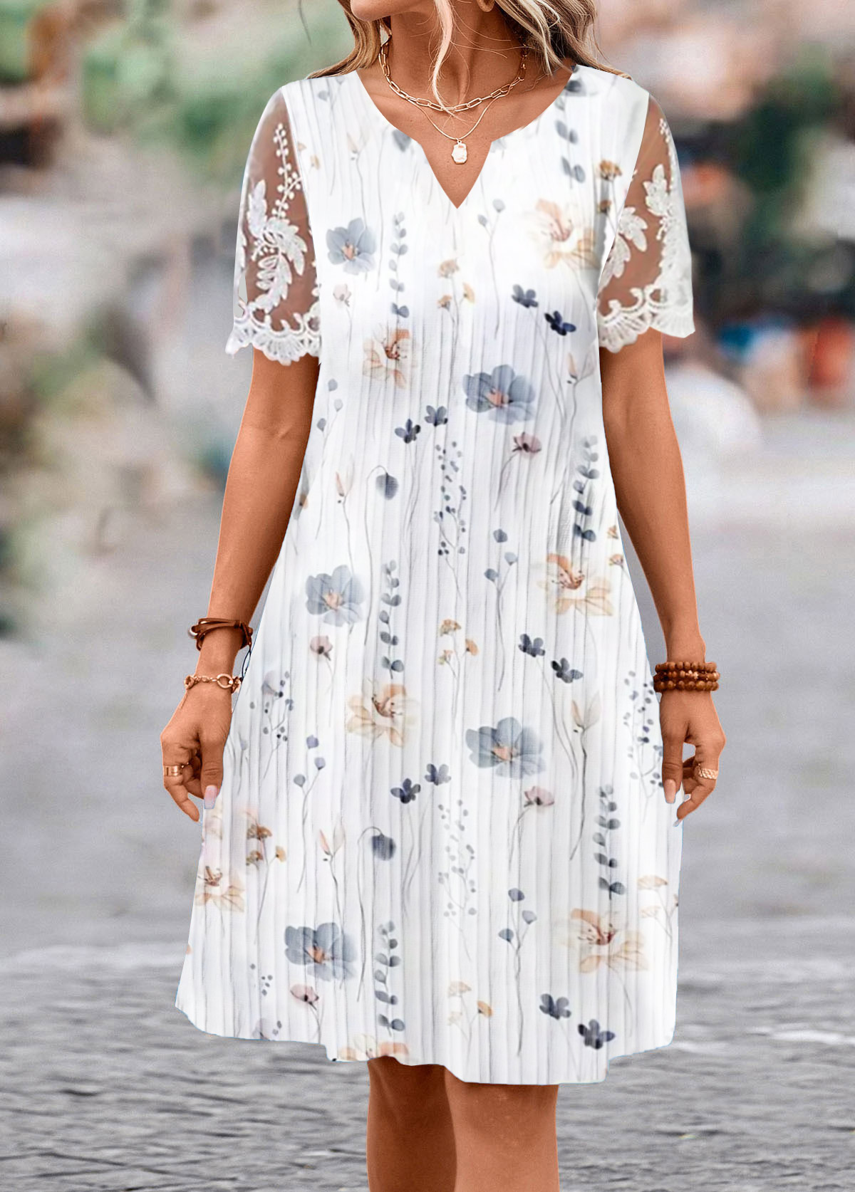 White Leaf Print Smocked Short Sleeve Split Neck Dress