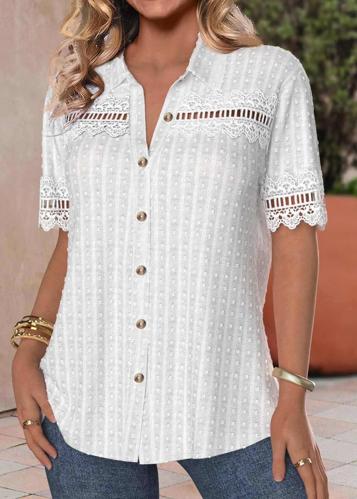 White Patchwork Shirt Collar Button Up Thin Blouse