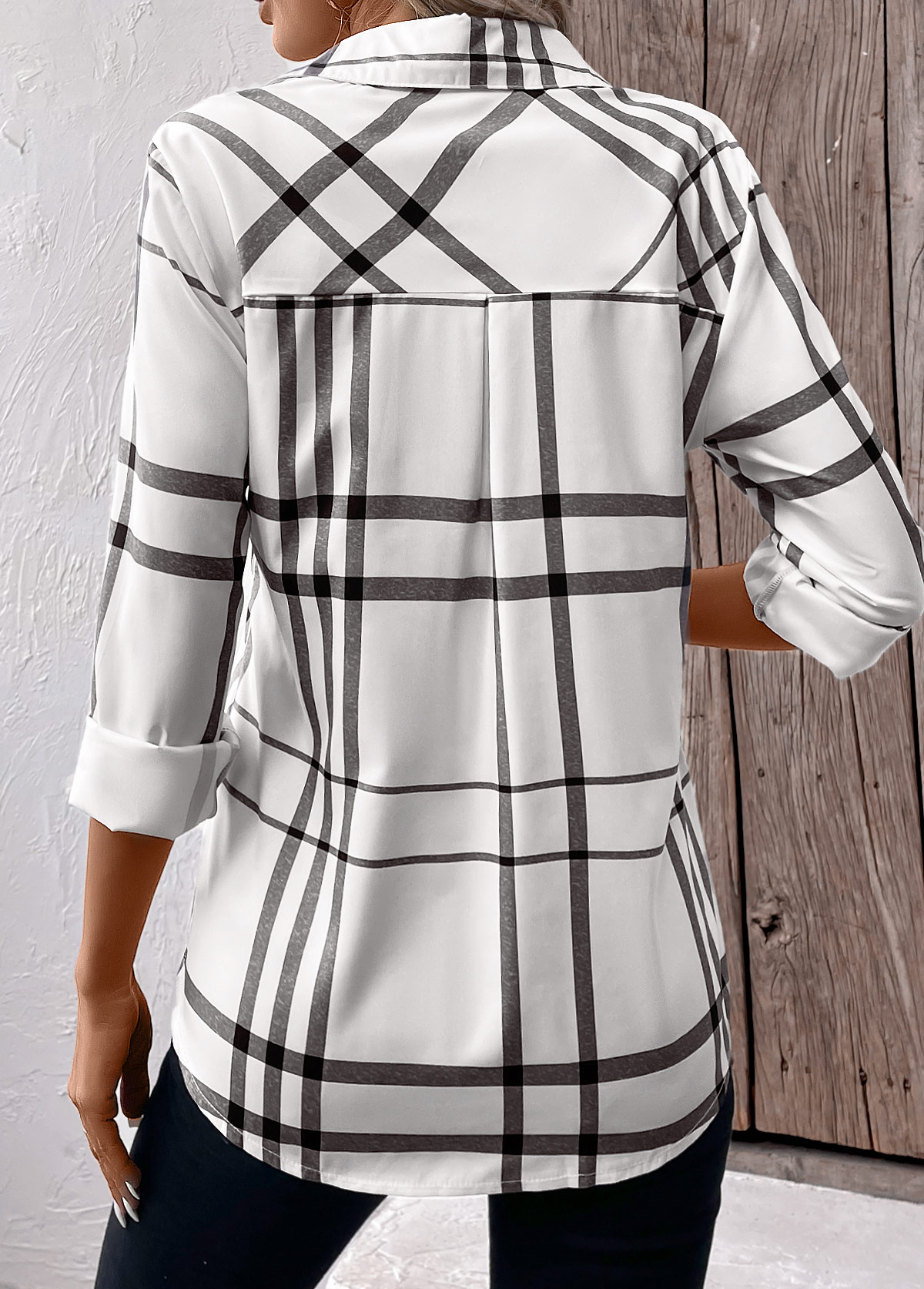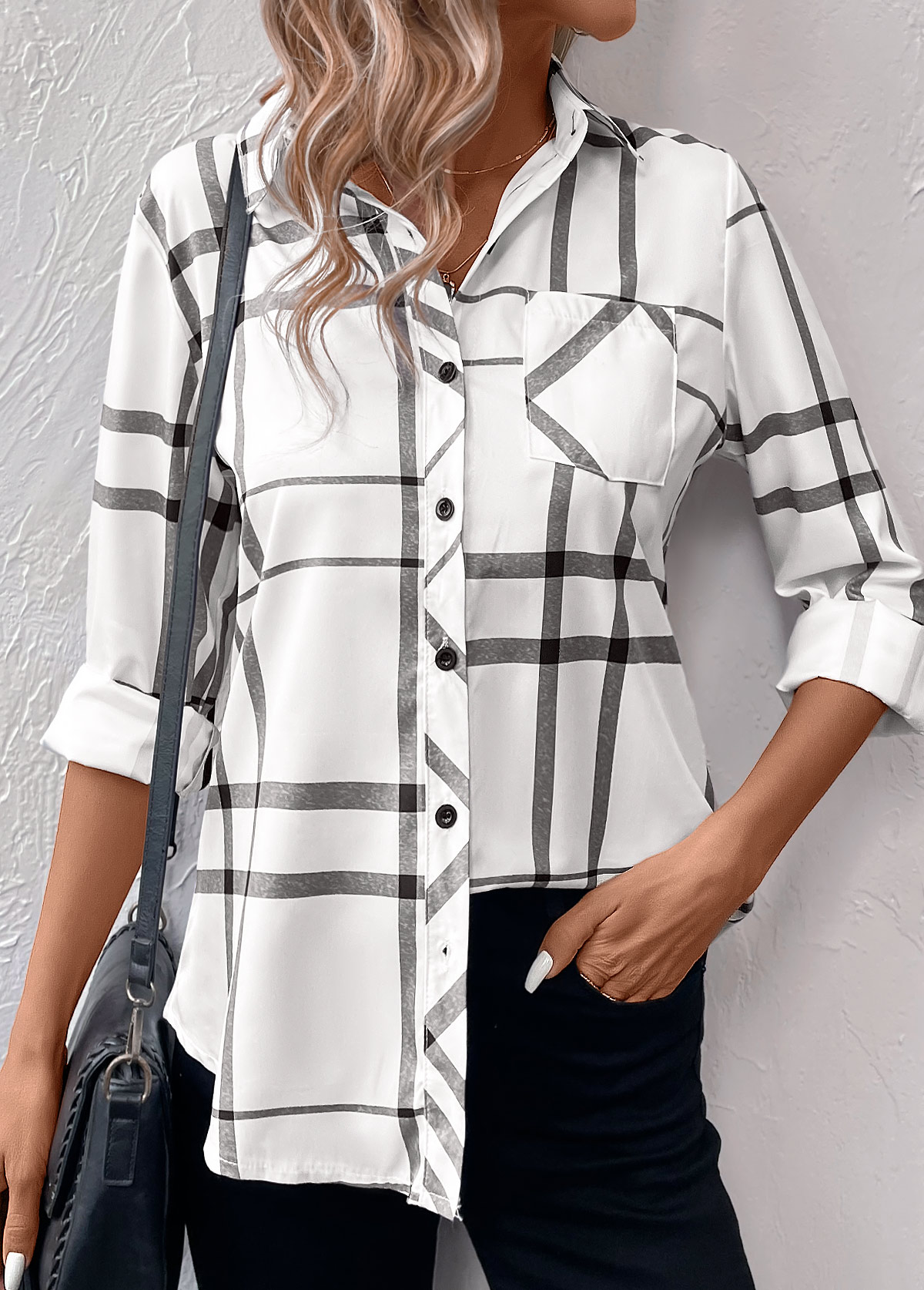 Multi Color Pocket Plaid Short Sleeve Shirt Collar Blouse