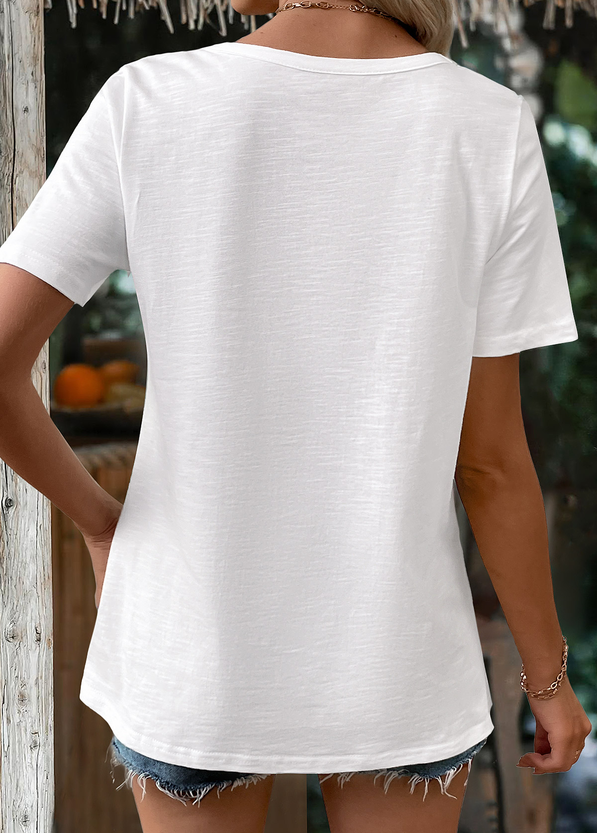 White Curved Hem Short Sleeve Split Neck T Shirt