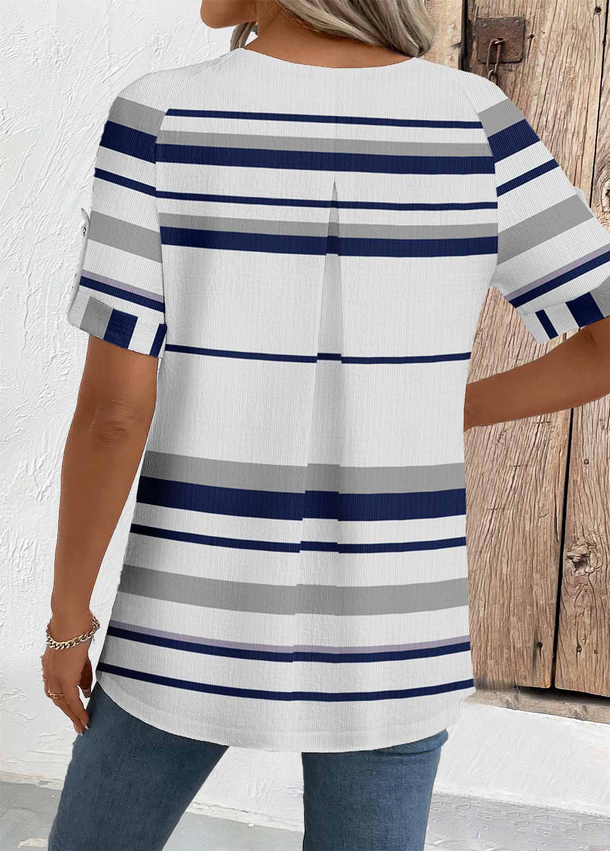 Blue Striped Short Sleeve Split Neck T Shirt