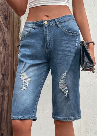 Dark Blue Hole Button Fly Denim Shorts
