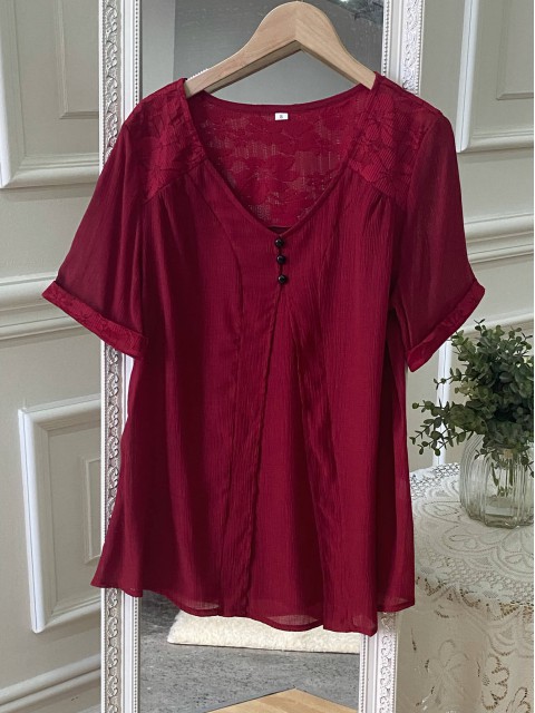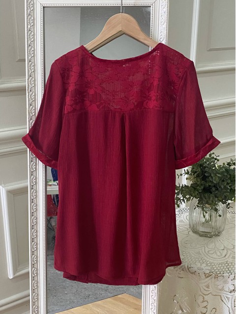 Wine Red Tummy Coverage Long Sleeve Split Neck Blouse