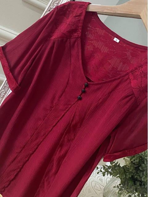 Wine Red Tummy Coverage Long Sleeve Split Neck Shirt