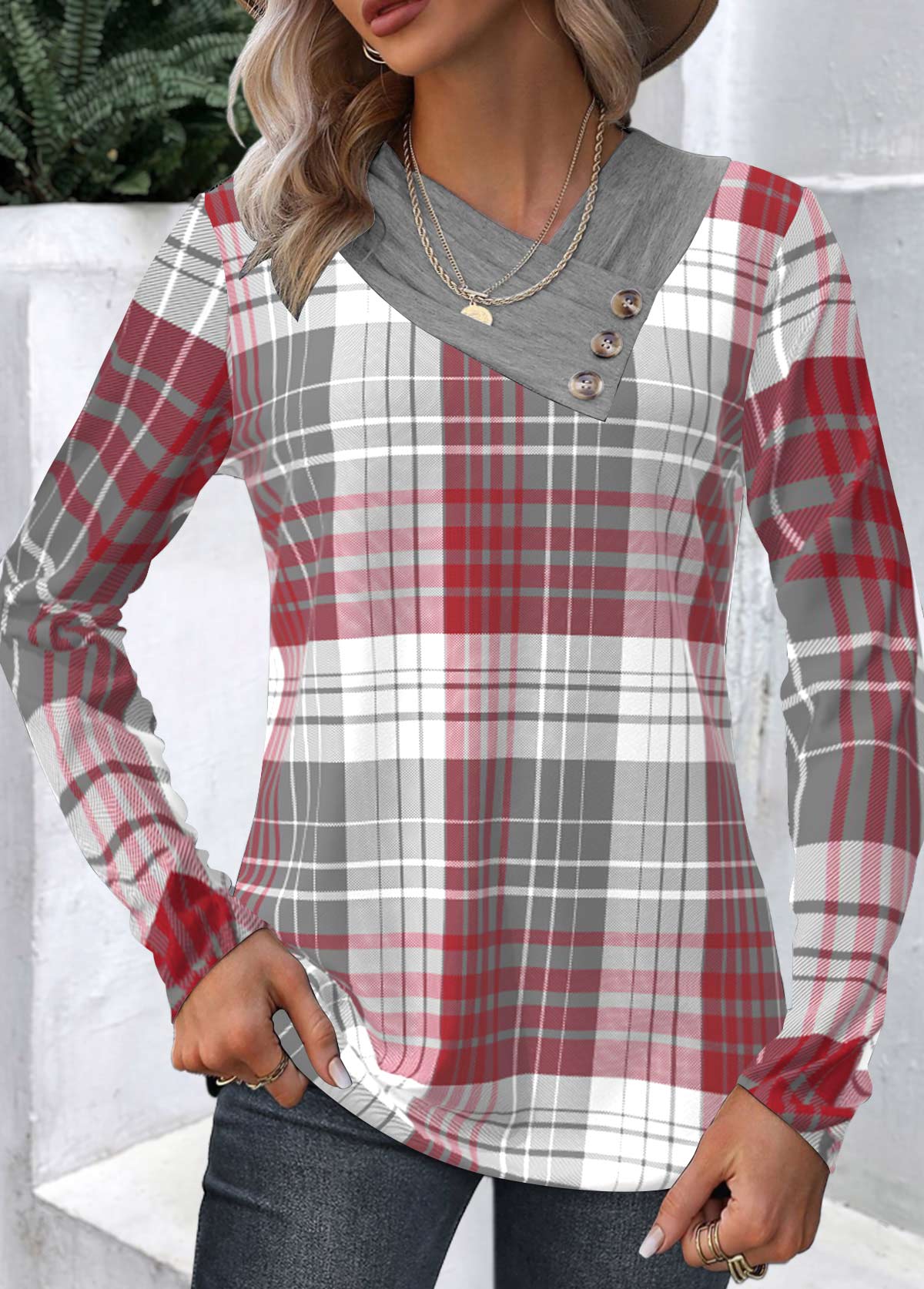 women's clothes / Tops / Sweatshirts&Hoodies  /  Wine Red Patchwork Plaid Long Sleeve Asymmetrical Neck Sweatshirt