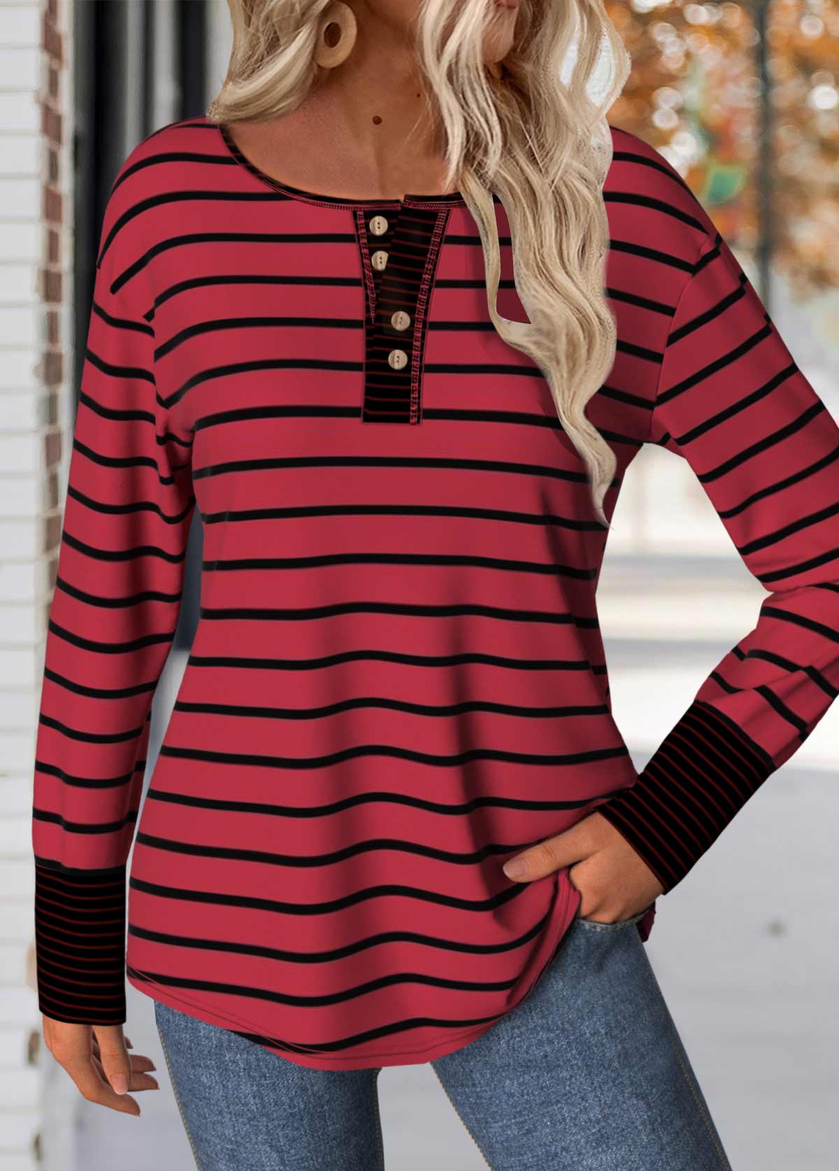 Red Curved Hem Ombre Long Sleeve Split Neck Blouse