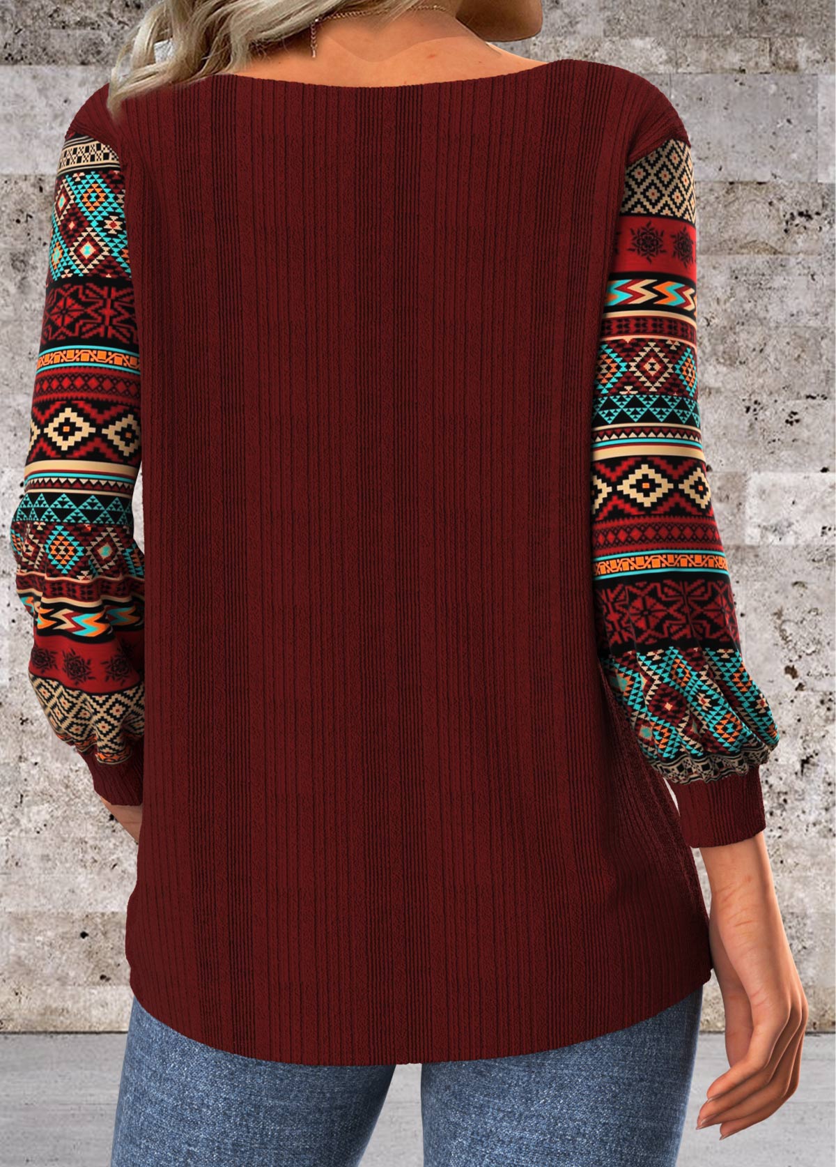 women's clothes / Tops / Tees&T-shirts  /  Wine Red Patchwork Tribal Print Long Sleeve T Shirt