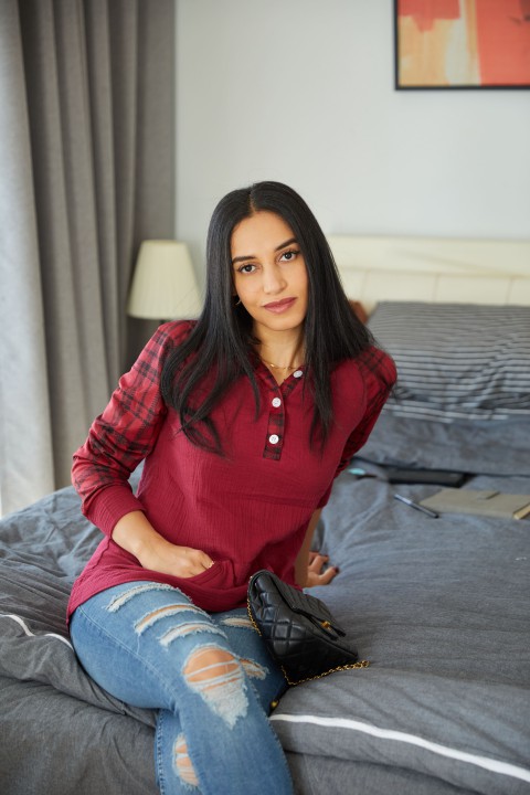 Light Camel Tummy Coverage Plaid Long Sleeve Sweatshirt