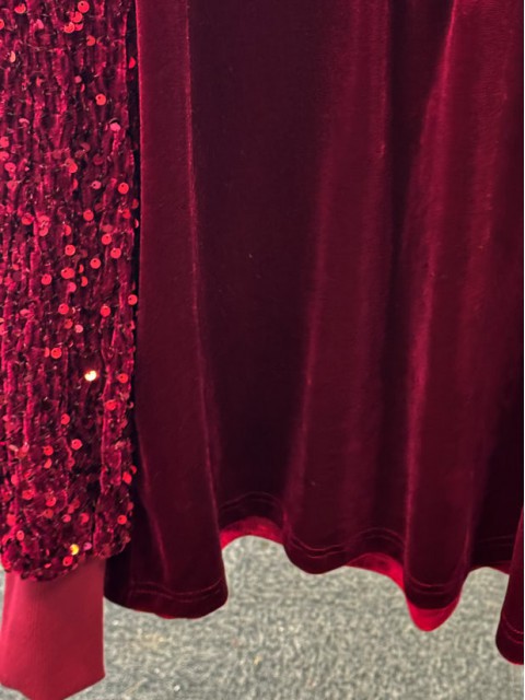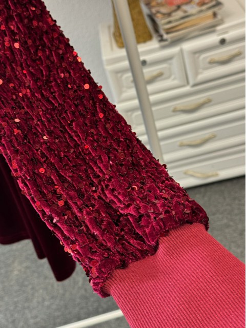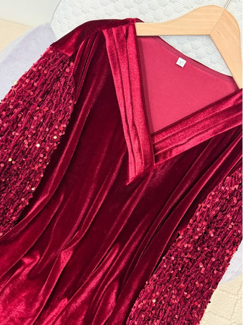 Wrap yourself in elegance with this wine-red velvet tee. The stylish V-neck features a chic patchwork design, while shimmering sequins adorn the sleeves, adding a touch of glamour. Crafted from ultra-soft knit fabric, its mid-length cut provides flattering tummy coverage. Perfect for casual outings or festive gatherings, it’s a versatile wardrobe staple!