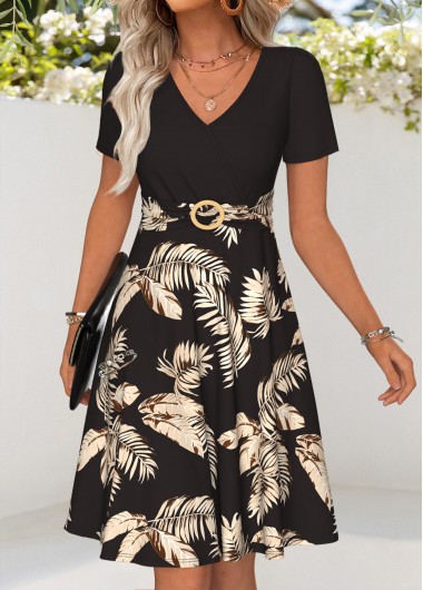 Added Successfully Black Tummy Coverage Leaf Print Short Sleeve Dress