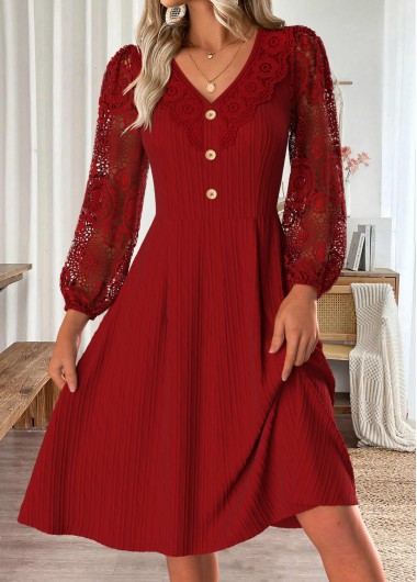Added Successfully Wine Red Patchwork Plaid Long Sleeve V Neck Dress